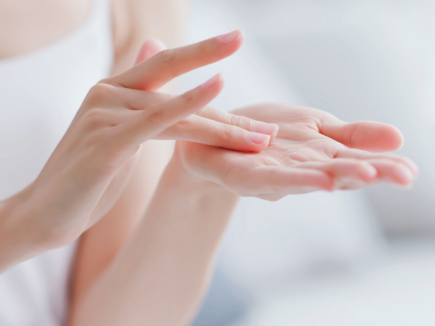 スキンケアをする際は、手のひらでつつみこむように化粧水やクリームをなじませましょう。